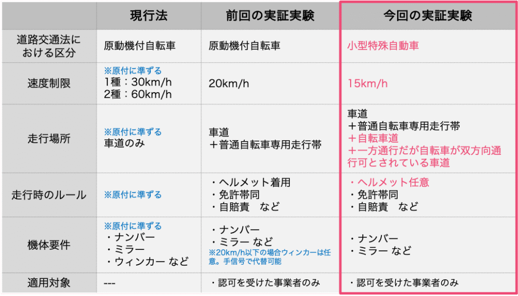 ・走行時のルール:新たにヘルメットの着用が任意(安全の観点から着用は推奨)となります。免許の帯同や自賠責保険の加入などは引き続き義務となります。